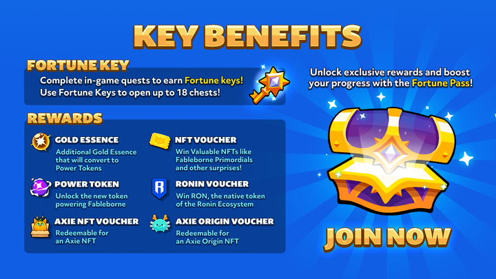 There are many ways to earn rewards during Fableborne Season 3 — and they all start with Fortune Keys and Fortune Passes. Complete in-game quests to earn Fortune Keys for a chance at scoring the rewards above! Buy Fortune Passes in Mavis Store to get Chests, which unlock even more rewards including Gold Essence, POWER tokens, RON tokens, regular axies and Origin axies.