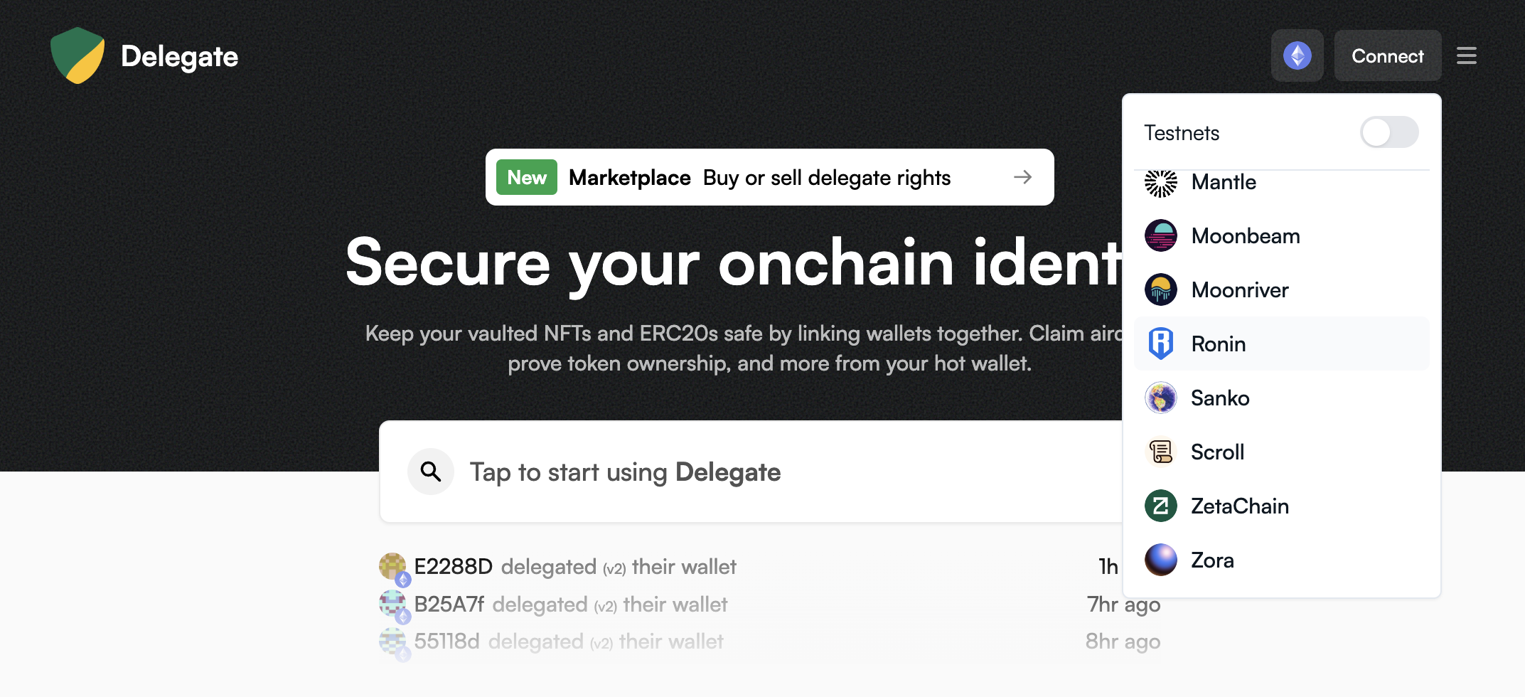 Wallet Delegation is now LIVE on Ronin with Delegate.xyz! Link Ronin wallets, NFTs, and smart contracts together to bolster on-chain security, claim airdrops, prove token ownership, and more. After reading this article, you’ll know how to delegate your Ronin address – and why you might want to. Let’s jump in!