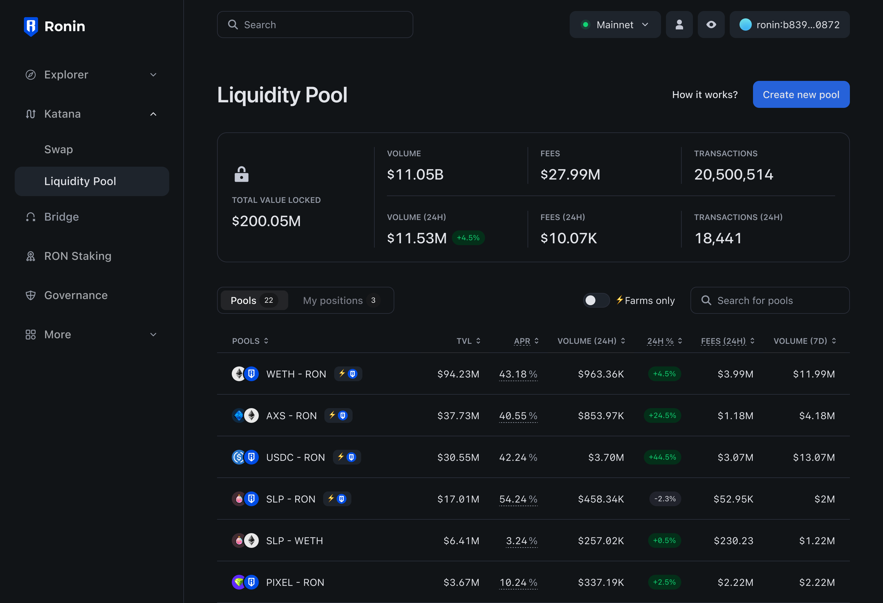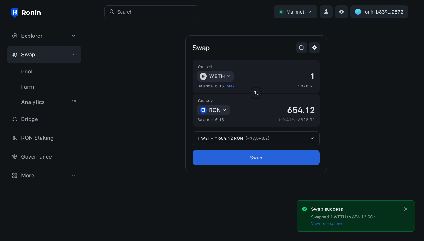 Today’s release brings Katana to app.roninchain.com. Swap, Pool, Farm, Bridge, Stake, and more – all from one place! This simplified UI makes it easy for new users to navigate our ecosystem. Say goodbye to bridging on Ronin Apps and swapping on the Katana website: you can now do it all at app.roninchain.com.