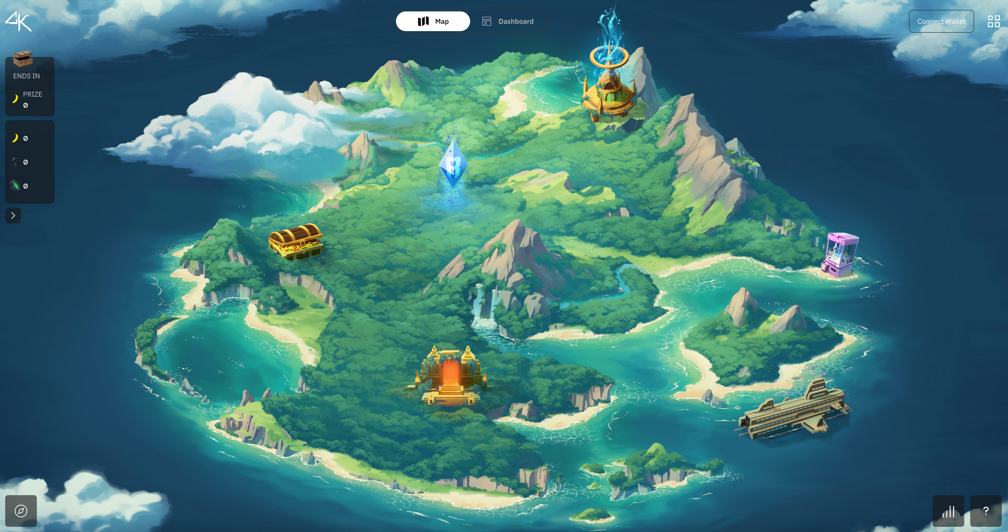 The Jungle Adventure Map is the main navigation menu you’ll see when entering the Play & Kollect dapp. Switch between Map and Dashboard and see key details including your current connected chain, Season and Prize Pool details, as well as $BANANA, Kongium, and Kredit balances. Here are seven key points of interest you can find on the map: