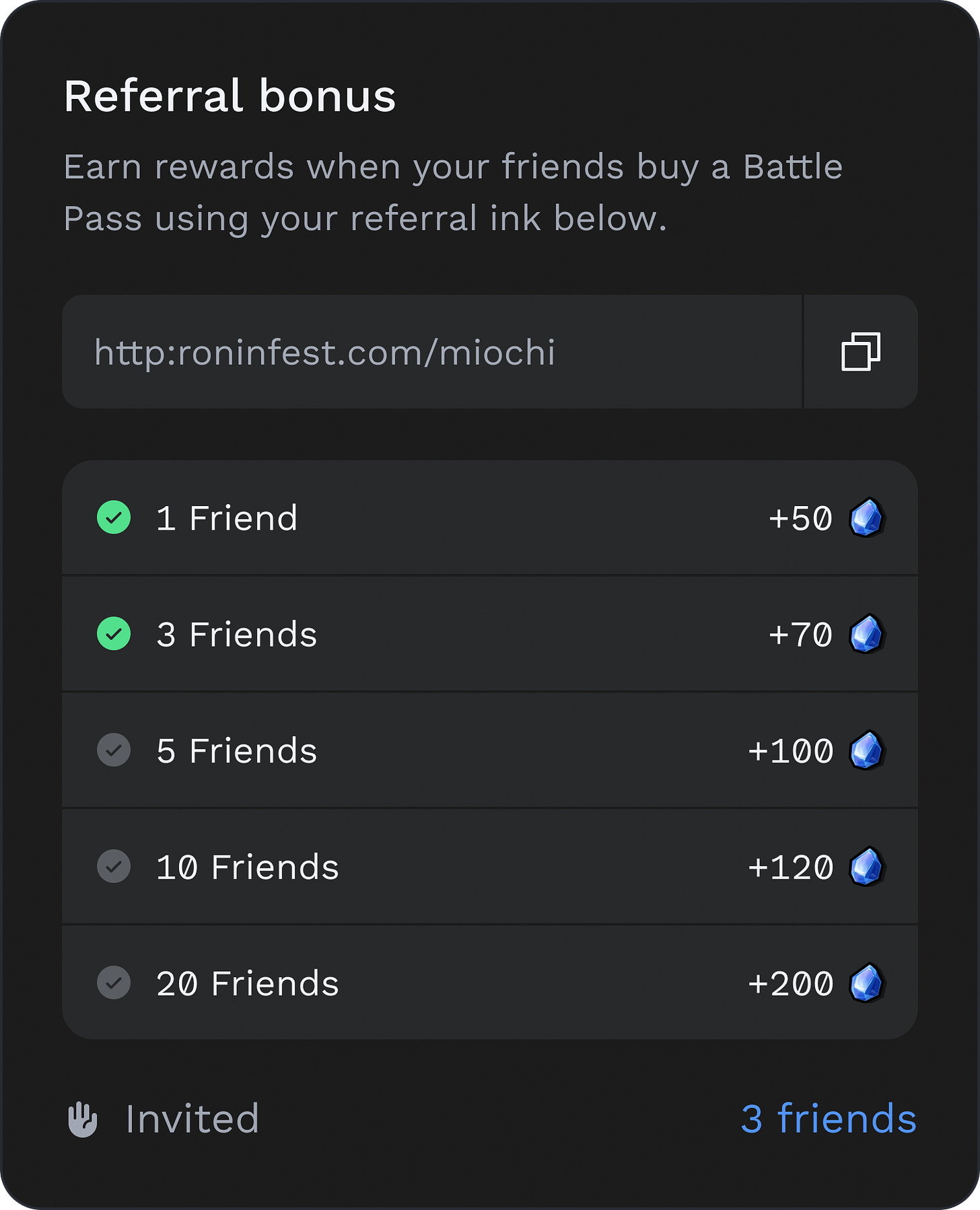 Invite friends to buy a Battle Pass with your referral code and earn up to 540 bonus points. For example, you’ll get 50 total points if one person buys a Battle Pass using your referral code. You’ll also get 120 total points if three people buy a Battle Pass using your referral code (50 + 70 = 120).