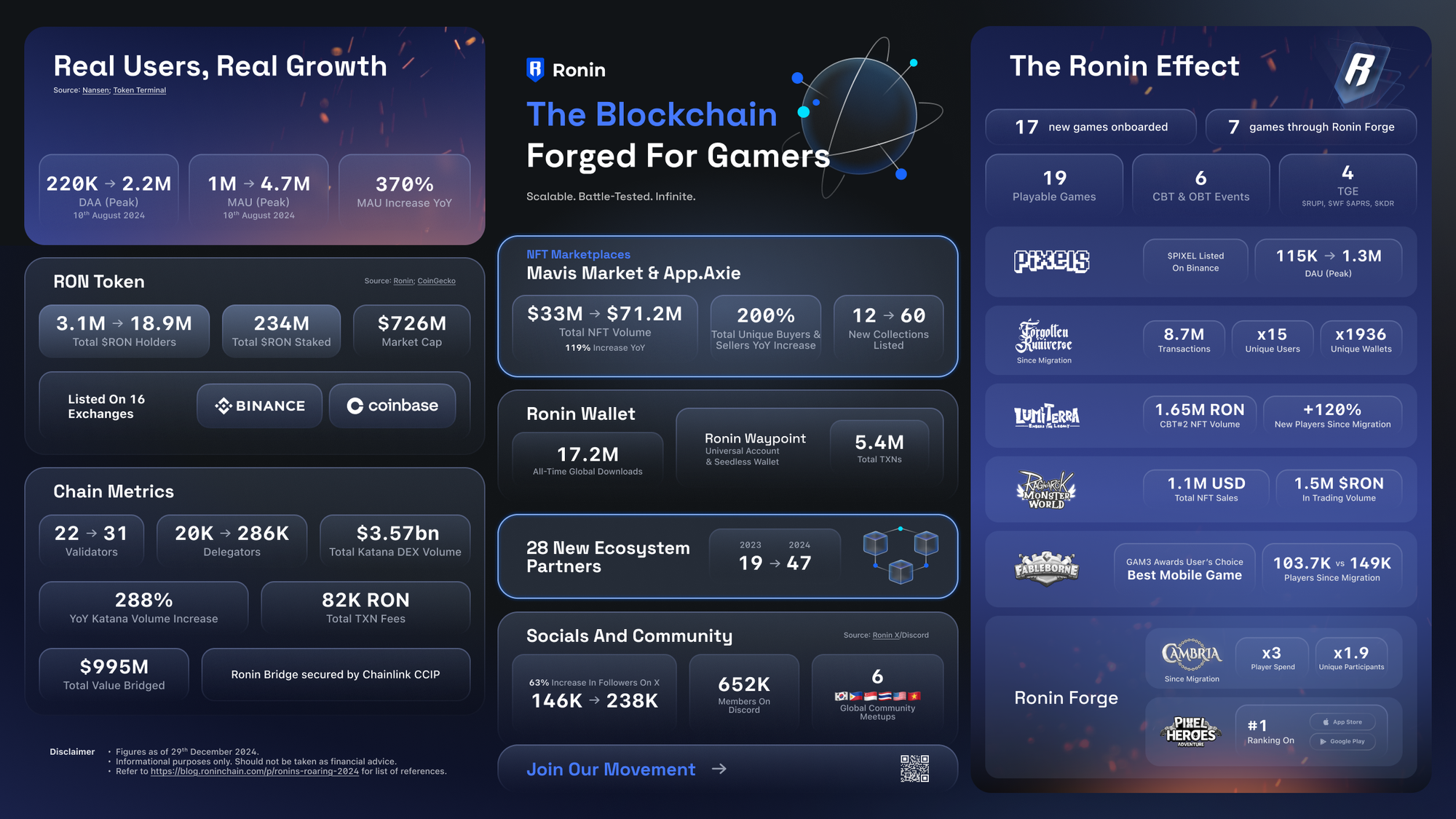 2024 was a year of building and foundation-setting. Many Ronin games hit all-time highs and some even won awards. Industry leaders from Coinbase to Chainlink have started to deepen their roots in our ecosystem, and they’re just getting started. These victories push our entire industry forward, and set the stage for a landmark 2025. Ronin’s Opening is almost here. Soon, builders from around the world and every corner of crypto will be able to join our movement. Will you be ready when they get here?