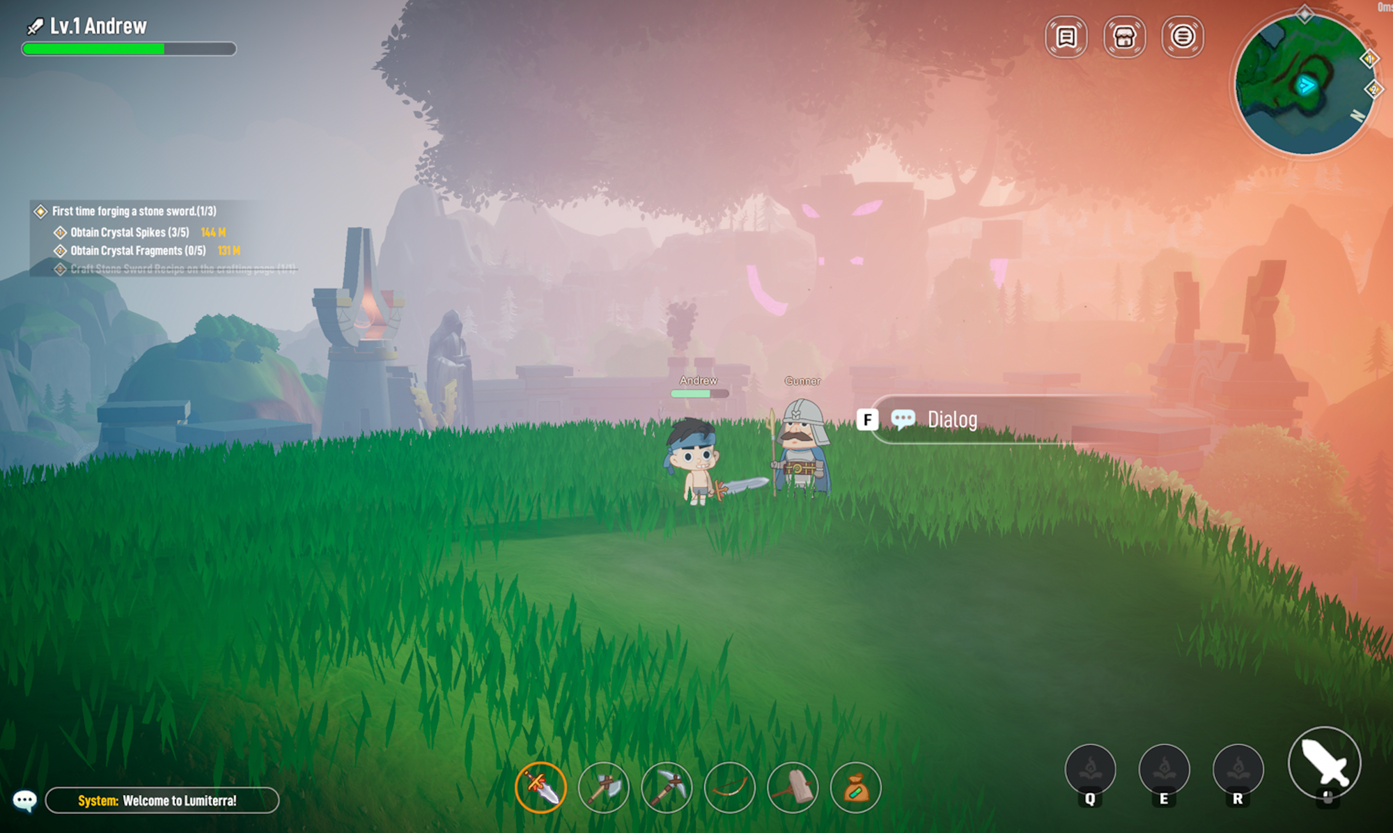 The Lumiterra team has designed beginner quests to help new players get started in the game. Once you’ve logged in for the first time, you’ll meet Gunner the knight. Get to know him and complete the quests he gives you! You’ll learn how to slay monsters, plant crops, gather resources, and even battle bosses.