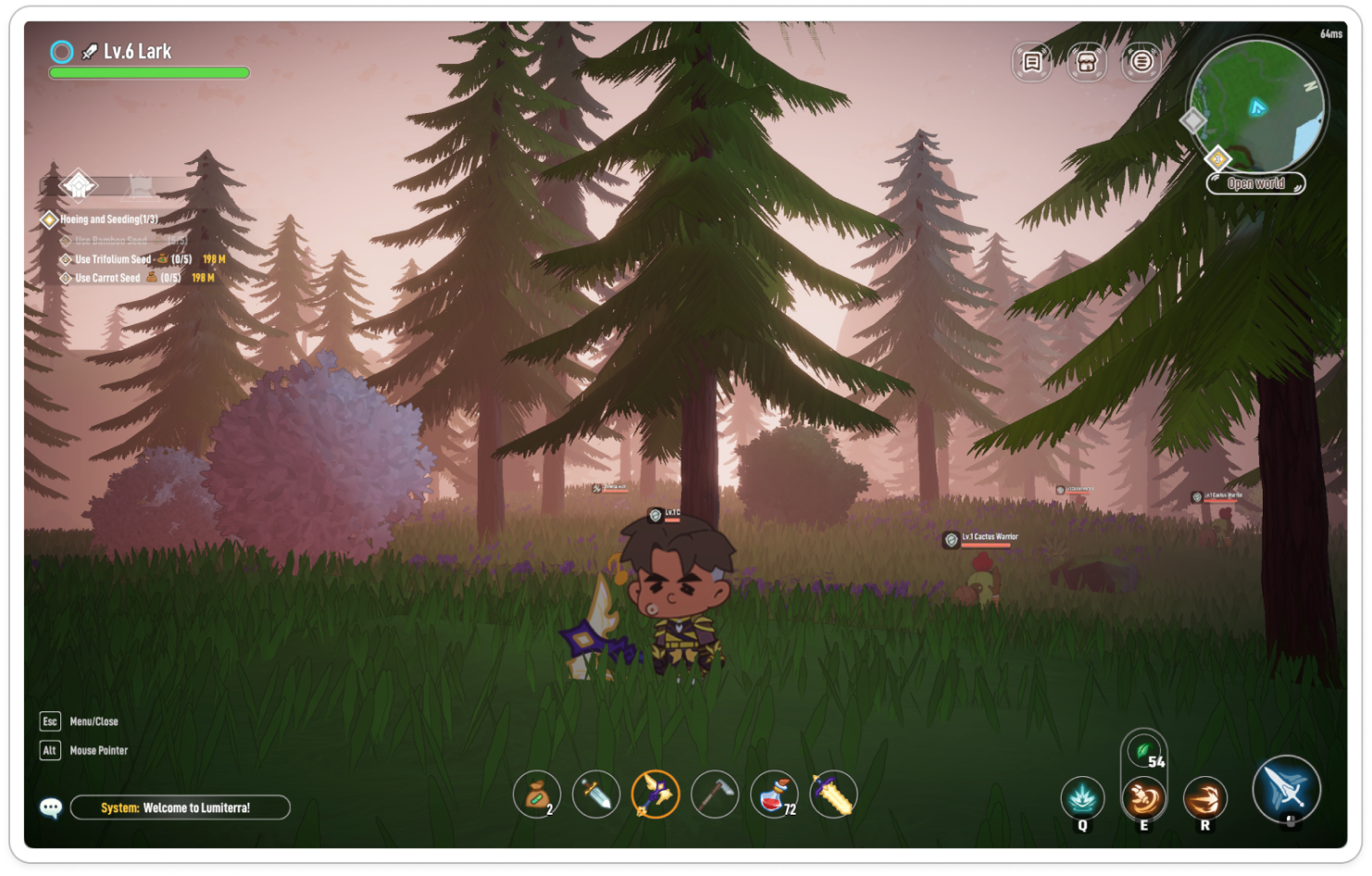 In Lumiterra, players roam free in an open-world filled with challenges and opportunities. What will you do when hostile monsters attack? The choice is yours: fight back, run away, or even tame them for your farm! Your character will level-up over time as you gain more experience in three specializations: combat, agriculture, and gathering. Fight monsters to gain combat EXP, tame them to gain agriculture EXP, and so on.