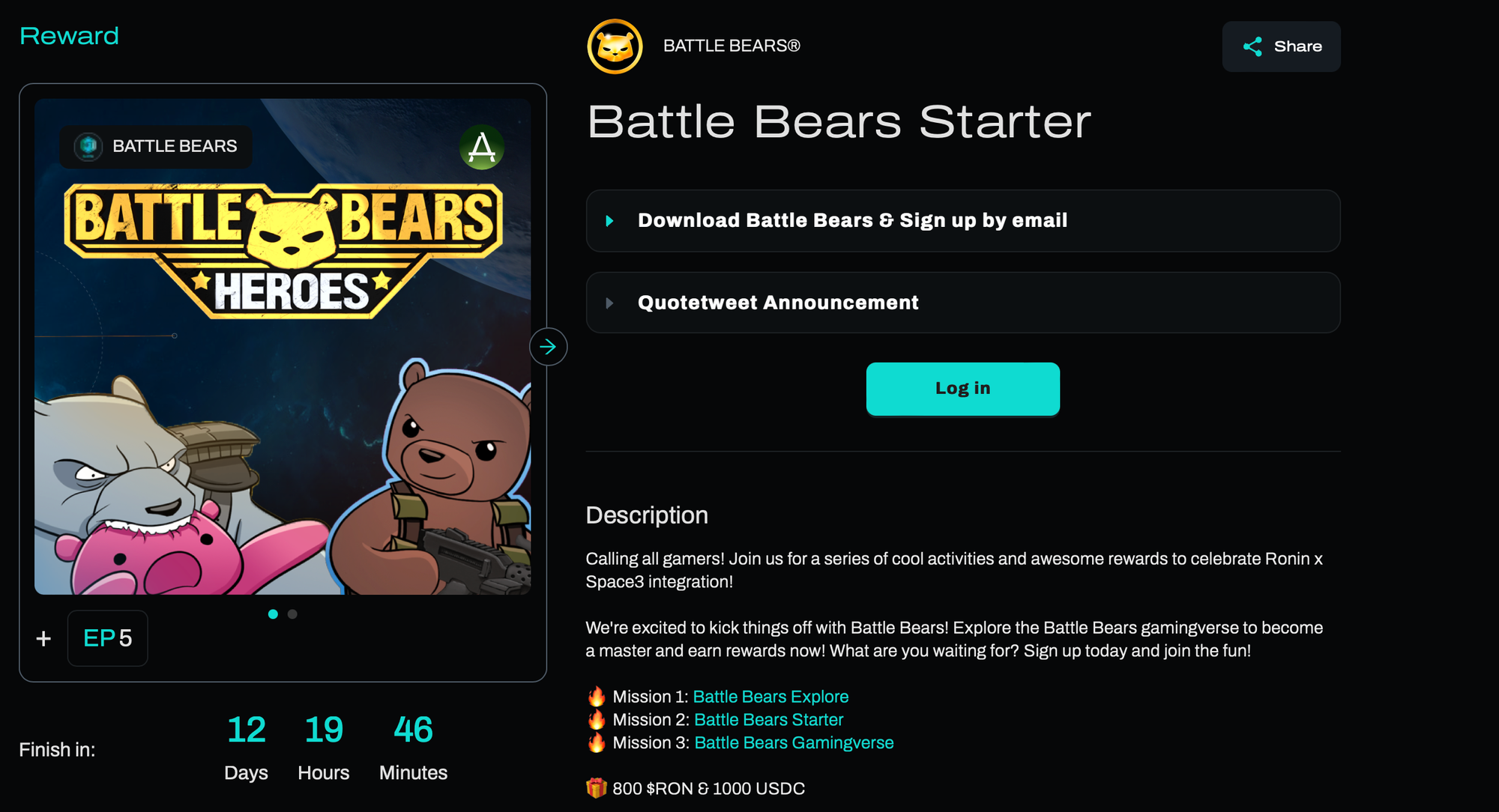 Space3 is a game publisher that builds blockchain-based gamified experiences for Web2 and Web3 games. Complete social missions, earn points and badges, and unlock exclusive rewards. Complete their Ronin wallet missions to get a sense of how Space3 works – it may remind you of Moku’s social quests. Today, Space3 has integrated the Ronin wallet. That means they can now build social campaigns, missions and quests for a variety of Ronin games! We’ll walk you through these missions below. Space3 is working towards launching social missions for Battle Bears next.