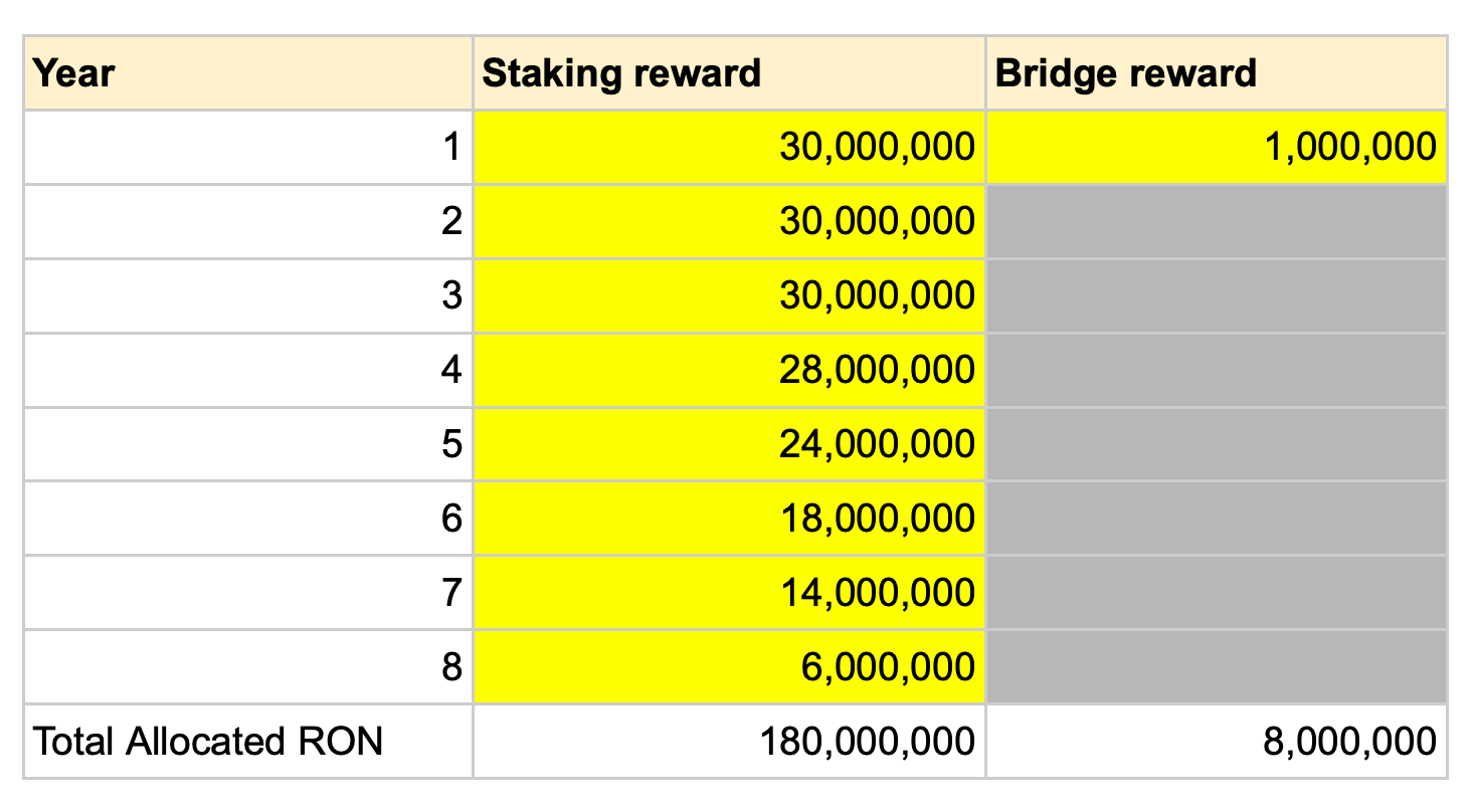 Bridge Operators process deposits and withdrawals between Ronin and Ethereum currently. As the bridge currently doesn’t charge fees, incentives will be required to offset the costs of secure bridge operation. Each validator must maintain a bridge operator to claim their block rewards. We’ve set aside Bridge Rewards of 8M RON over 8 years, and have committed 1M RON for Bridge Rewards for year 1 while we research more sustainable bridge designs.