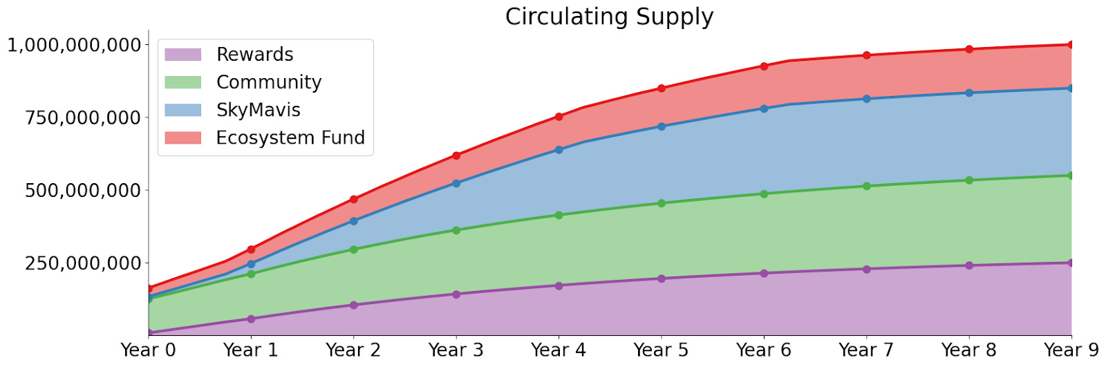 Today, ~21% of RON is in circulation. Over the next 12 months, an additional 3% will enter circulation through RON Staking Rewards and 1.1% for Q2 Katana Liquidity Mining. Consider that the Ecosystem Fund, RON Staking Rewards, Katana Liquidity Program Rewards, and Sky Mavis itself will use their own individual allocations and emission schedules according to the specific budgets they’ve laid out which we discuss below.