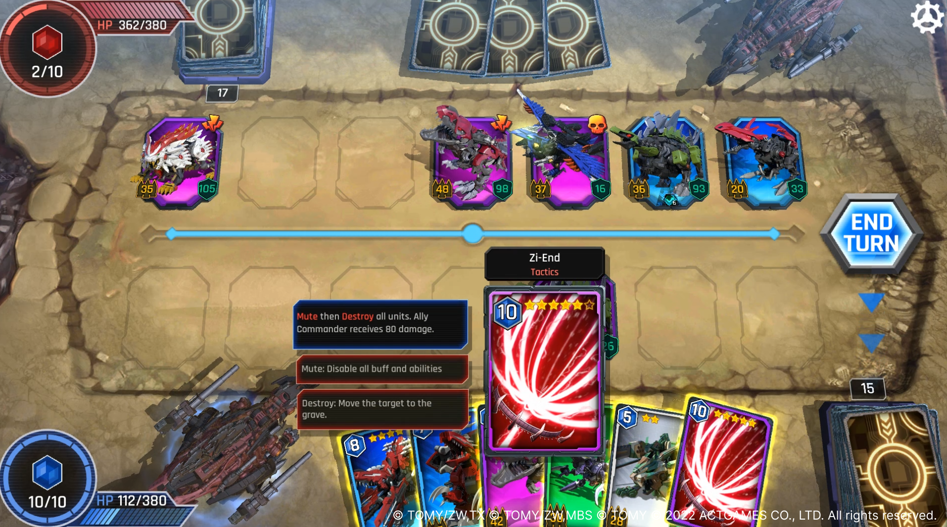 Decks are made up of Unit and Tactic cards: Unit cards are actual ZOIDS that occupy a position on the battlefield, while Tactic cards are skills a Commander can play to get a leg up in the match. Both of these cards can attack and defend. For example, Omega Rex is a Unit card that costs 9 Mana to summon and destroys all surrounding units below a certain HP. On the other hand, Meteor Strike is a Tactic card that also costs 9 Mana to play, dealing damage and stunning surrounding units. The main difference between Unit and Tactic cards is that Unit cards take up a card slot after you summon them while Tactic cards go to the graveyard after you’ve played them.